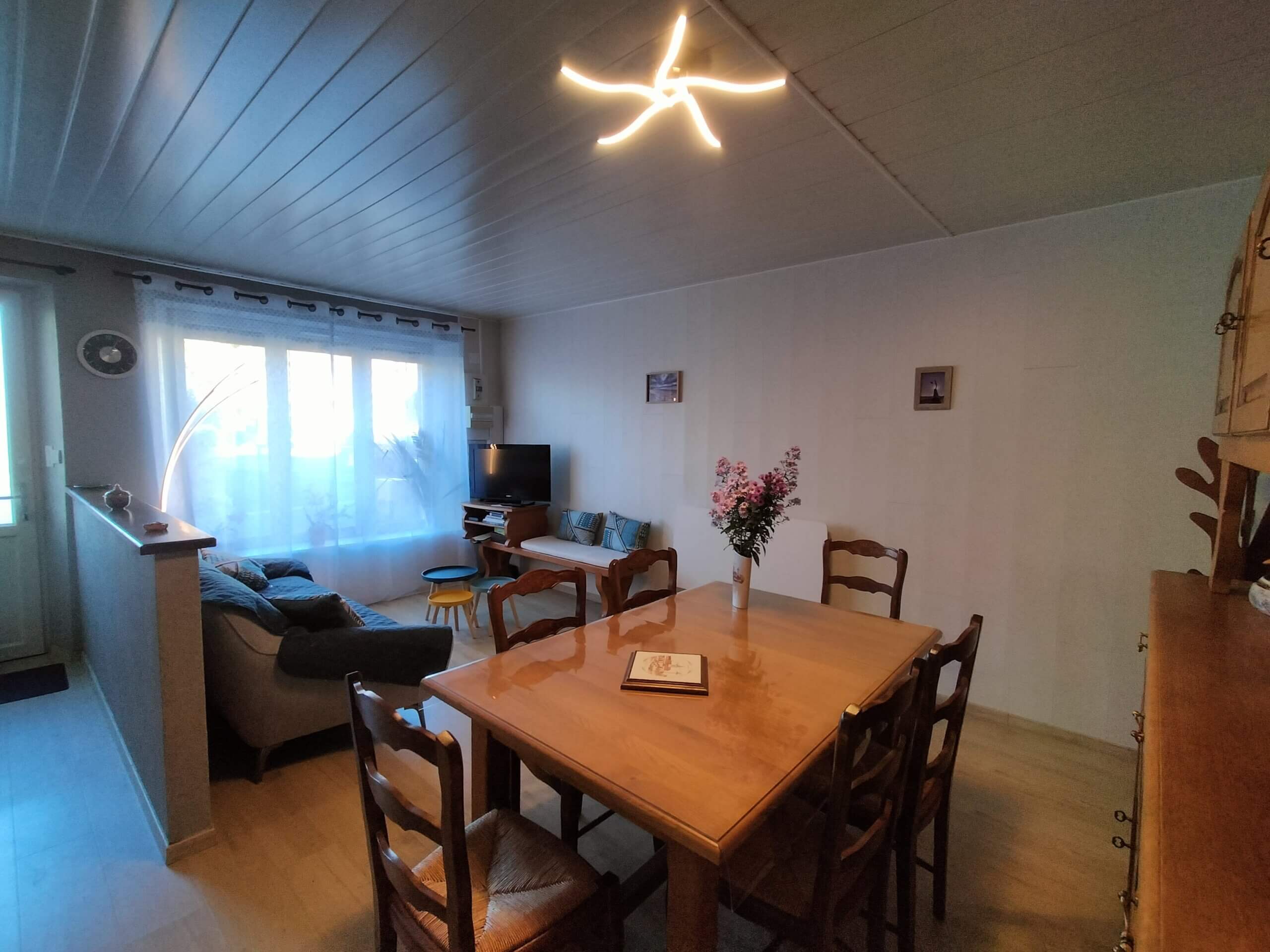 Vous logerez dans une maison ossature bois, avec bardage extérieur en pin douglas et intérieur en peuplier, isolation en laine de bois, toiture en ardoise de pays, construite sur un terrain de 520 m² avec jardin clos. Elle est composée, au rez-de-chaussée, d’un garage (4 places de stationnement devant la maison), d’une entrée avec dressing, d’une grande pièce de vie cuisine/repas et salon avec accès sur une grande terrasse couverte, de deux chambres avec literie neuve en 160/200 et dressing, une salle de bain avec grande douche et de WC séparés.